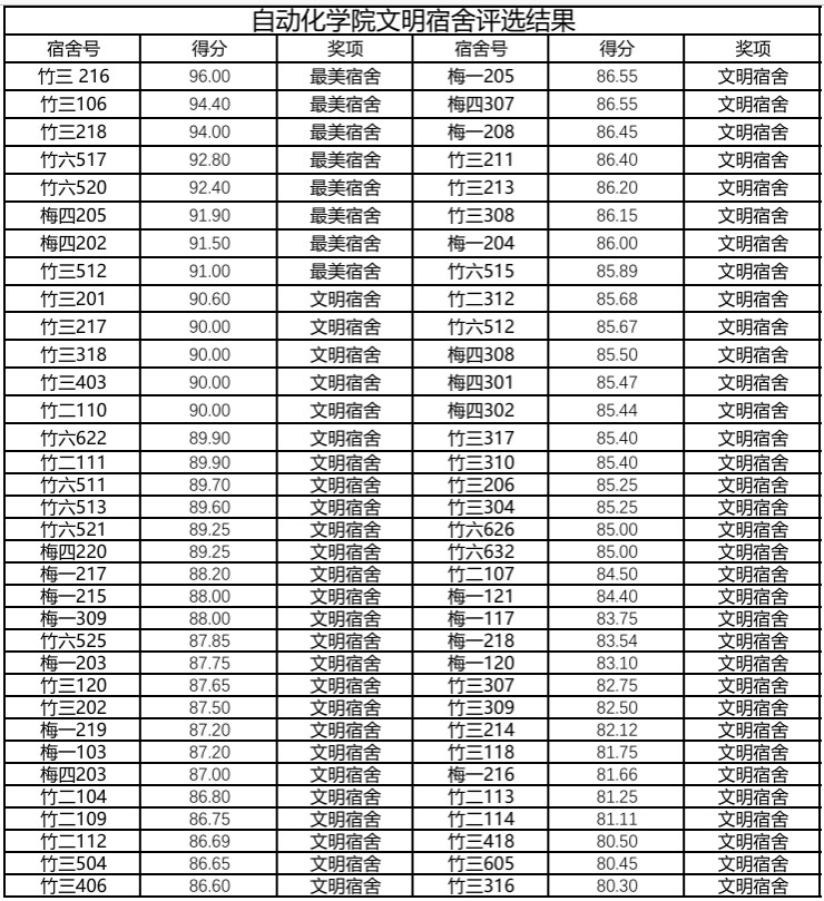 本次评比创新采用"四维考评体系",从内务管理、学风建设、安全规范、文化特色四大维度制定量化评分标准,对宿舍卫生清洁度、用电安全规范、学习氛围营造、文化墙设计等20余项指标进行全面考核。经过院学生会纪律委员会历时两周的四轮严格评审,最终68间宿舍凭借整洁的环境、浓郁的学风和独特的文化创意脱颖而出,晋级校级文明宿舍。最终获奖名单如下: